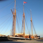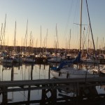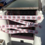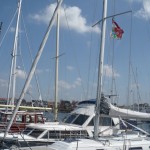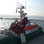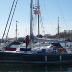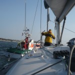 17:00 Uhr kommen wir am Kiel LT an und ich funke „Seenotrettungskreuzer Berlin – Seenotrettungskreuzer Berlin – Seenotrettungskreuzer Berlin, hier ist Novomind – Novomind – Novomind…“. Ich wechsle gemäß Anweisung auf Kanal 10 und gebe an, dass wir putzmuntere 4 Crewmitglieder sind, keiner verletzt und wir nicht in Gefahr sind. Kurze Zeit später und kurz vor dem Zielhafen Laboe kommt Steppken angebraust, umkreist uns und gibt uns Anweisung, die Segel zu bergen. Wir sind immer noch auf der hohen Kante bei 6 Bft unter Vollzeug im zweiten Reff… ohne Motor. Also zeigen wir, was wir können: Ein blitzsauberes Seemanöver ohne Motor, hart am Wind. Kurs hart am Wind, Groß weit offen, an der Windkante entlangstreifend, bergen wir erst das Groß und hinterher die Fock. Wir werden langsamer. Jetzt kommt Steppken auf uns zu und übergibt uns einen Hahnepot (eine Leine mit zwei Augen), deren beiden Enden wir auf die vorderen Klampen legen. Danach kommt Steppken noch einmal auf uns zu und übergibt uns die Schleppleine, die wir einhaken. Und schwupps die wupps sind wir 20 Minuten später im Hafen von Laboe ankommen und längsseits am beschissensten Steg des Hafens, auflandig und dem Schwell der Transportschiffe ausgesetzt, die regelmäßig in Richtung Nordostsee-Kanal unterwegs sind. Nachts um 3 Uhr ist Alarmstart aus dem Bett: wir müssen raus und die Leinen verdoppeln, da die an der Belastungsgrenze angekommen sind.