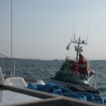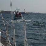 Wir kratzen am Baum und geben Rasmus einen kleinen Schluck, damit Wind kommt. Und… es tut sich was. Er fängt an zu blasen. Das war wohl zuviel Schnaps und zuviel Kratzen. Der Wind wird stärker. Auf dem Weg nach Kiel reffen wir das Groß und verkleinern die Fock. So zischen wir also im zweiten Reff auf der hohen Kante mit zwischenzeitlich 7 kn über Grund nach Kiel. Unterwegs rufe ich den Hafenmeister an, der mir mitteilt, dass in Laboe im Hafen 5-6 Bft blasen und der Hafen voll ist. Kein guter Plan für ein Seemanöver mit einem 2t Schiff ohne Motor im Hafen. So macht der Hafenmeister das Rettungsschiff Berlin mit Tochterboot Steppken klar, bekannt aus Funk und Fernsehen. Wir sollten das Rettungsschiff per Funk, Kanal 16, in der Nähe von Kiel Leuchtturm anrufen und auf weitere Anweisungen warten.