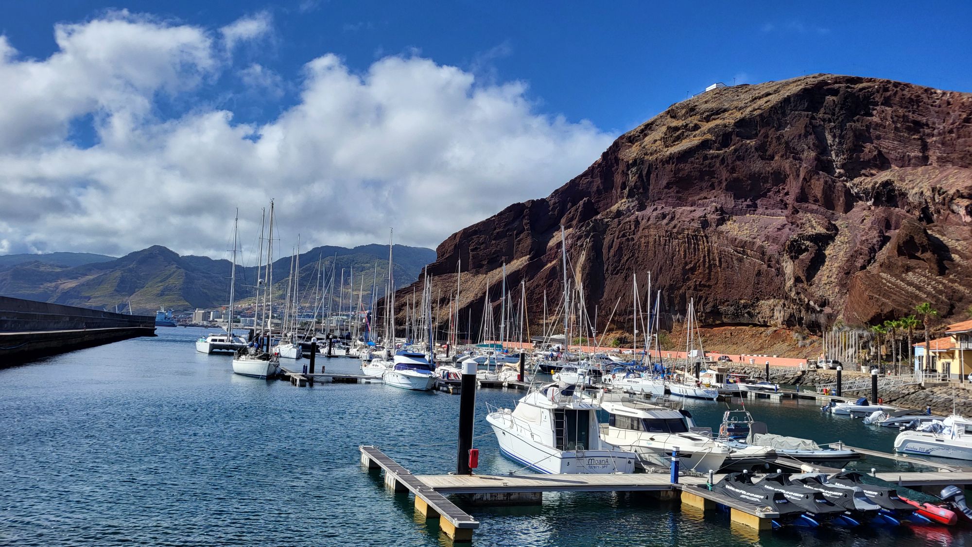 Jetzt bin ich am Hafen, trinke noch eine Cola und genieße das Treiben hier im Hafen inmitten einer Felslandschaft von Madeira.