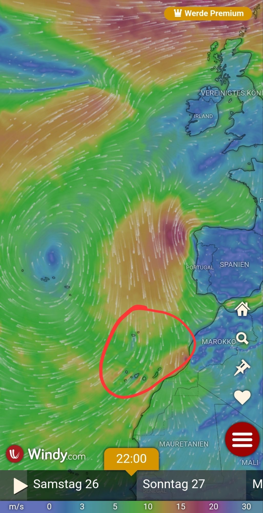 Der Grund: vor der Biscaya liegt ein Tiefdruckgebiet. Der Wind vom kommenden große Hoch wird an der östlichen Seite vom Tief beschleunigt und reicht von Madeira bis nach Lanzarote. Deswegen fällt der planmäßige Stopp auf Porto Santos weg und es geht direkt nach Lanzarote. Das heisst, wir werden anfänglich Motoren, bis die Windfront kommt. Dann baut sich die Welle auf und wir werden mit 6-7 Bft und 3m Welle surfen und auf die Südostseite von Lanzarote nach Porto Calero fahren. Auf dem Bild der Rote Kringel ist das Törngebiet.