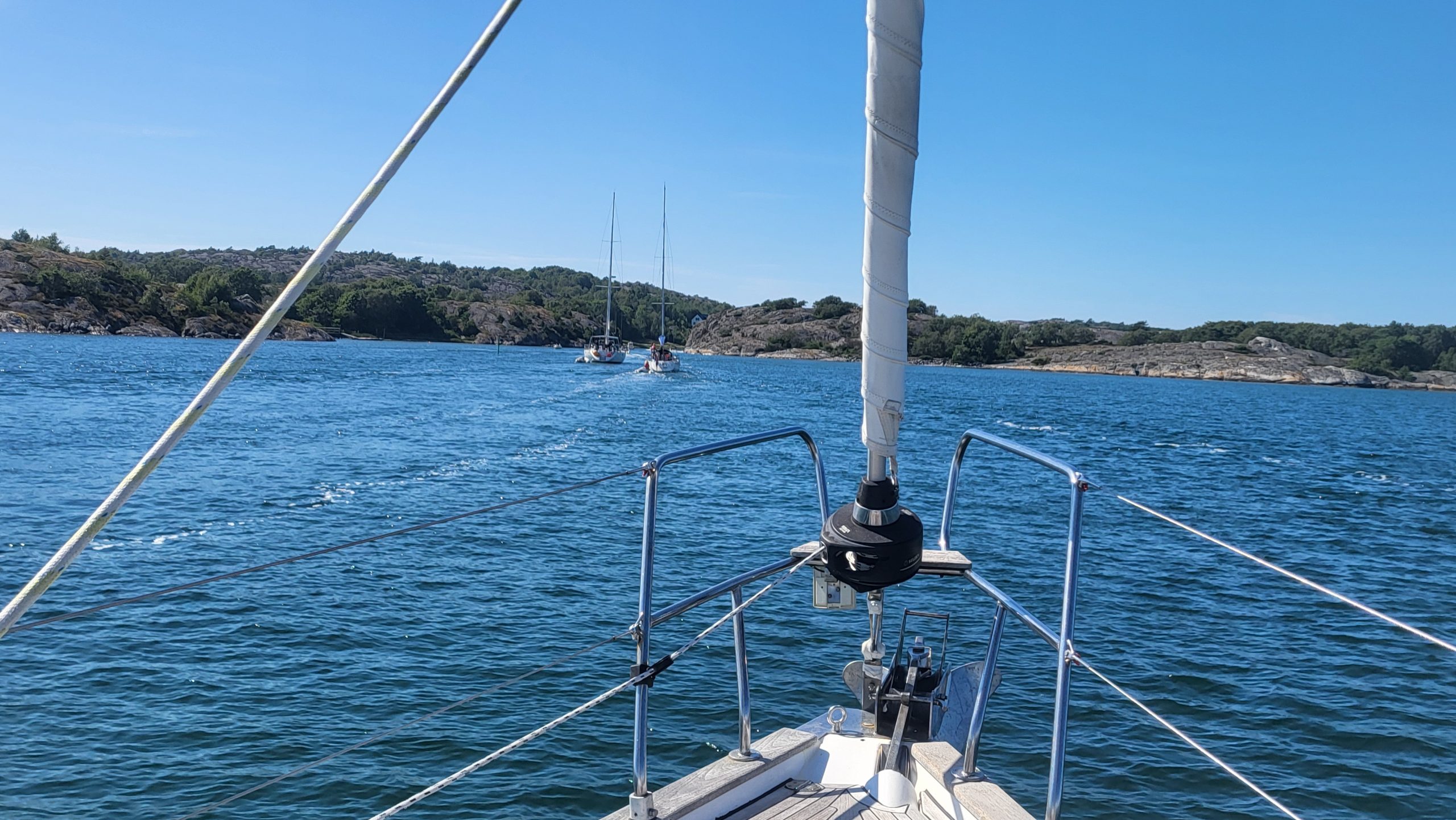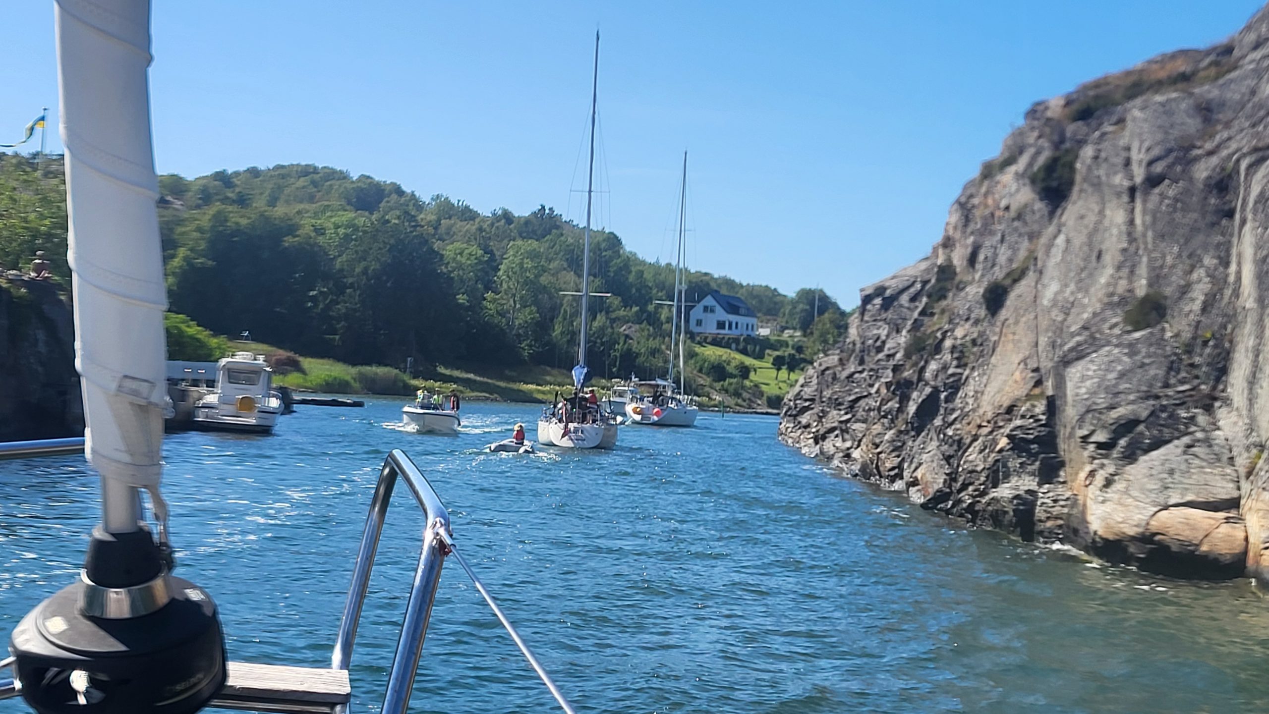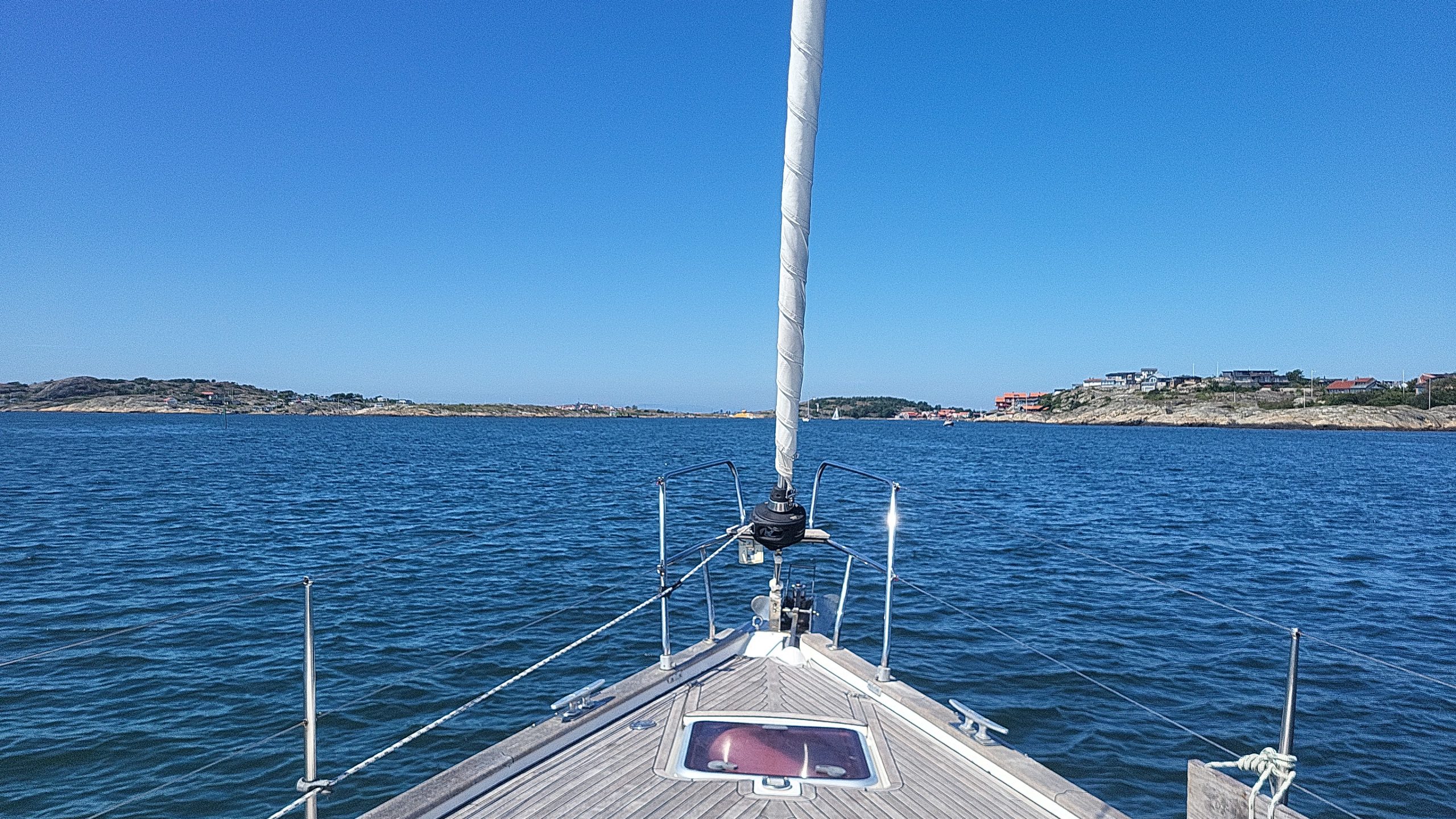 Ich kann das gar nicht wirklich in Worte fassen. Es ist unfassbar schön. Rechts und links die Felsen und wir segeln zwischen den Felsen mit Häuschen, Booten oder auch nur Seezeichen hindurch. Navigatorisch ist das schon sehr anspruchsvoll, da die vielen Inselchen ineinander vor dem Auge verschwimmen.