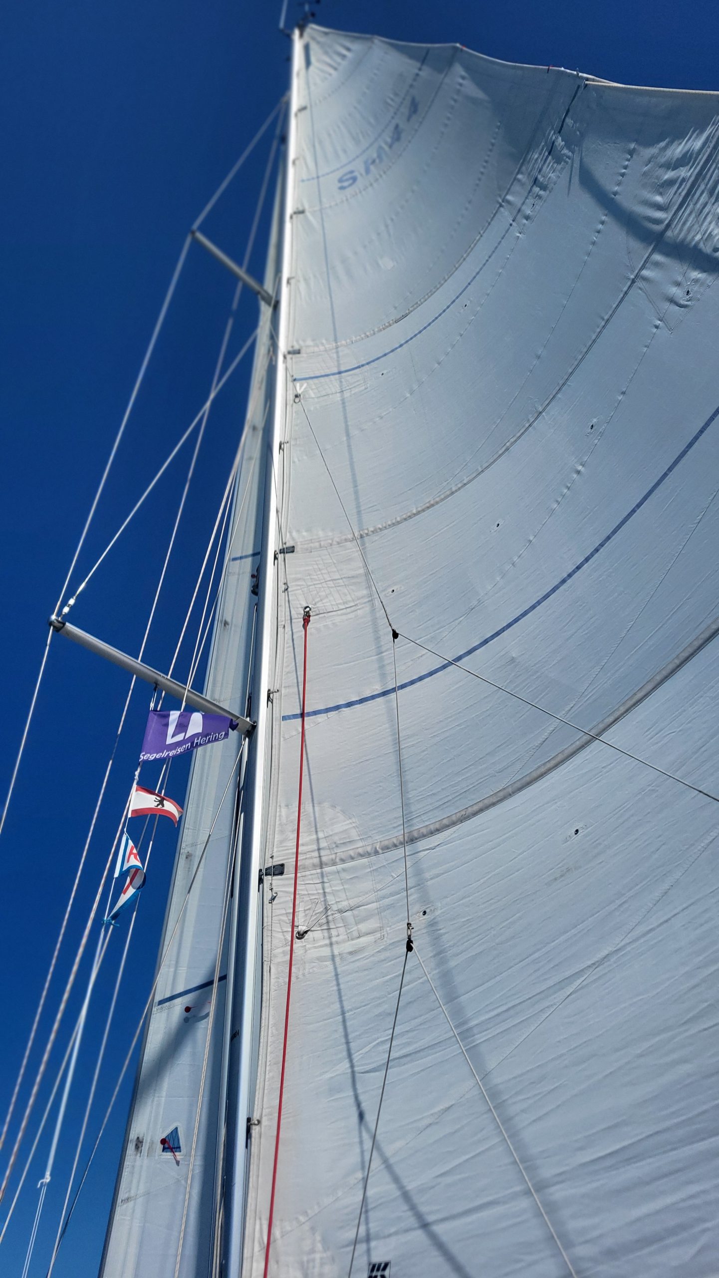 Wir haben 14 kn Wind. Bei 5 kn Fahrt macht das 9 kn scheinbarer Wind zum Segeln… bei noch vorhandenem Schwell. Also Segel drin lassen, Jockel an und direkten Kurs.