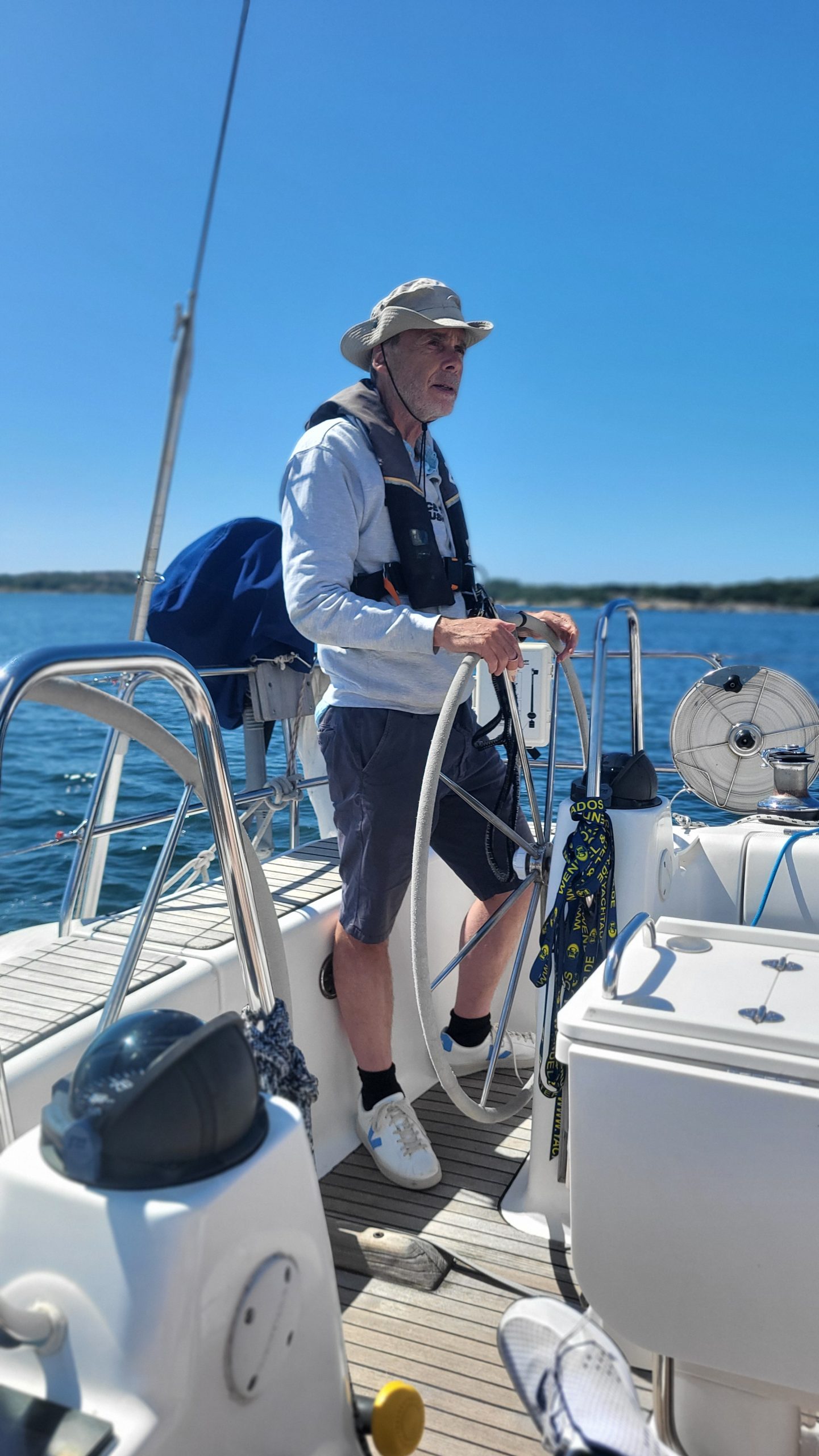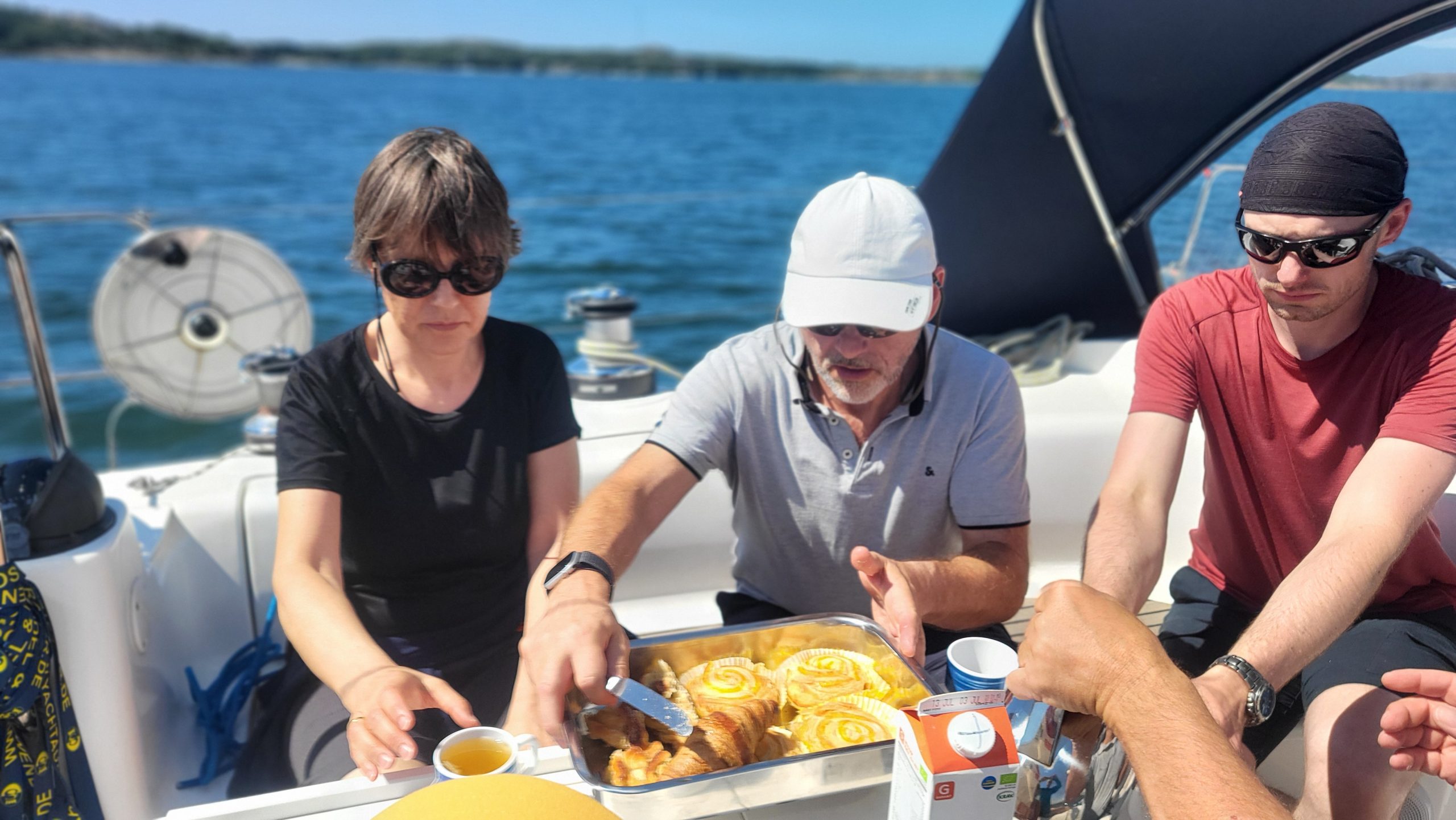 Das Wetter ist warm, der Himmel azurblau, das Wasser klar, die Sonne scheint. Es ist T-Shirt-Wetter. Unterwegs gibt’s Kaffee und Kuchen. Der Wind briest so vor sich hin. Wir segeln entspannt und genießen die Zeit.