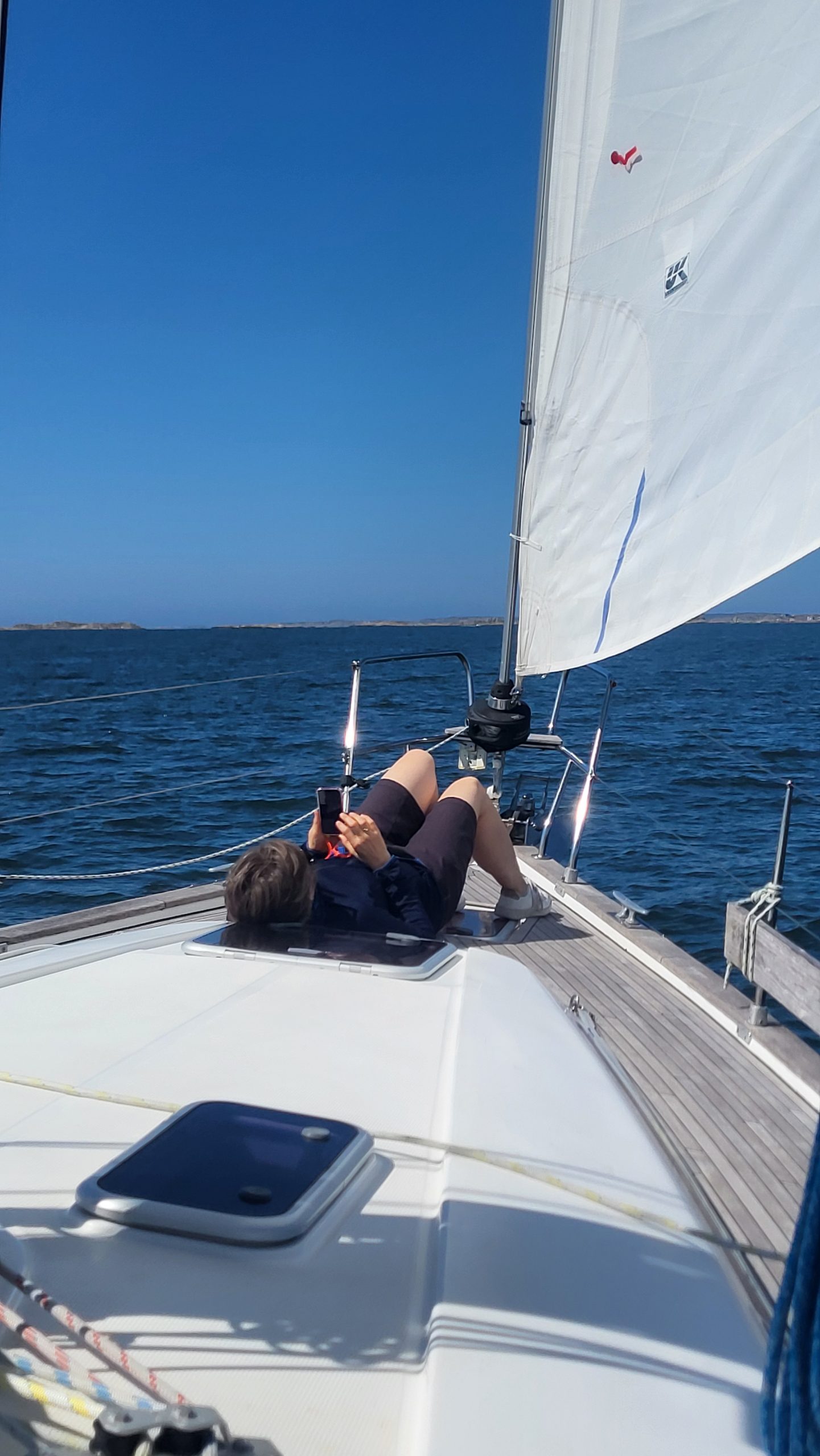 Heute tauschen wir die Fock gegen die Genua. Wir hörten, dass sich auf See 2 Windstärken versteckt haben sollen. Wir halten scharf Ausguck.